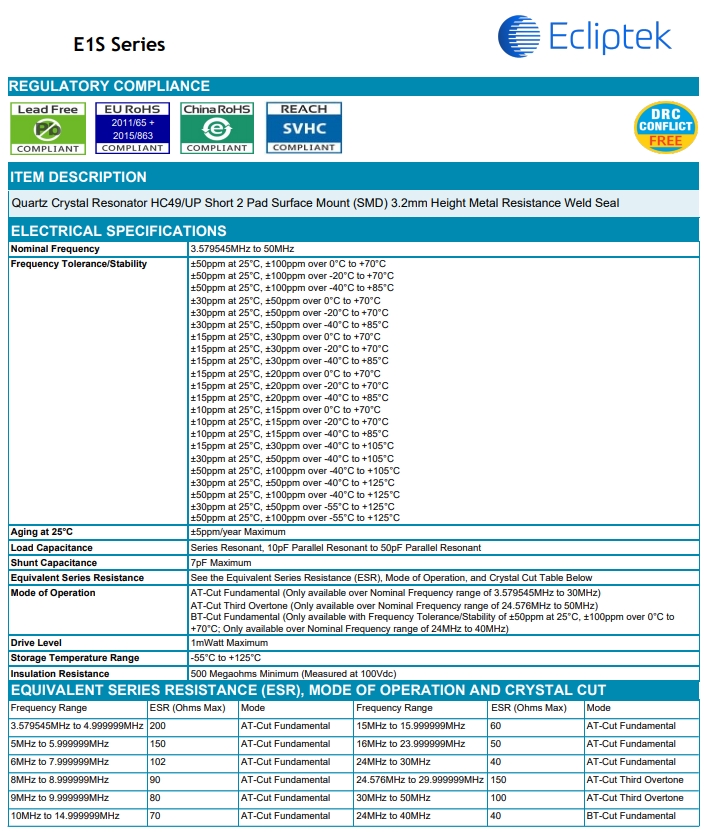 | EUAA18-20.000M | 表面貼裝晶體諧振器 | Crystal Resonator 20MHz ±50ppm (Tol) ±100ppm (Stability) 18pF FUND 25Ohm 2-Pin HC-49/U Thru-Hole Bulk | 0~70 |