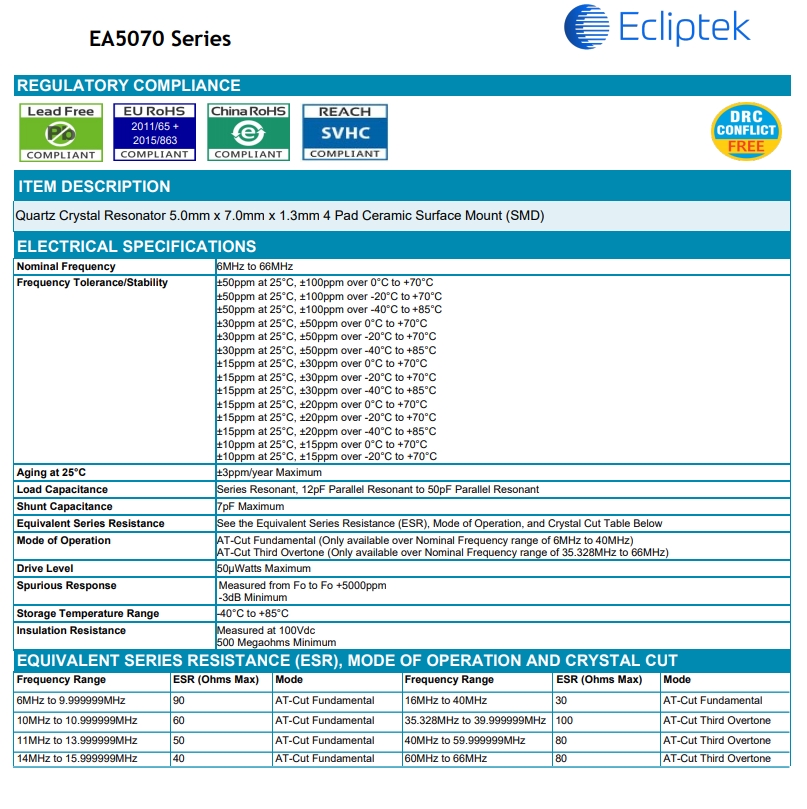 EA5070CA18-20.000M TR|EA5070晶振|石英晶體諧振器,物料編碼EA5070CA18-20.000M TR,型號(hào)EA5070,頻率20MHZ,精度±100ppm,負(fù)載電容18PF, 尺寸:7.0*5.0.1.5mm,溫度范圍:-40℃-85℃,貼片晶振,晶振,無(wú)源晶振,石英晶振,ECLIPTEK晶振,晶振廠家,石英晶體諧振器,應(yīng)用于聲控?zé)艄?智能機(jī)器人,咖啡機(jī),洗碗機(jī),智能水槽,電梯,智能晾衣架.