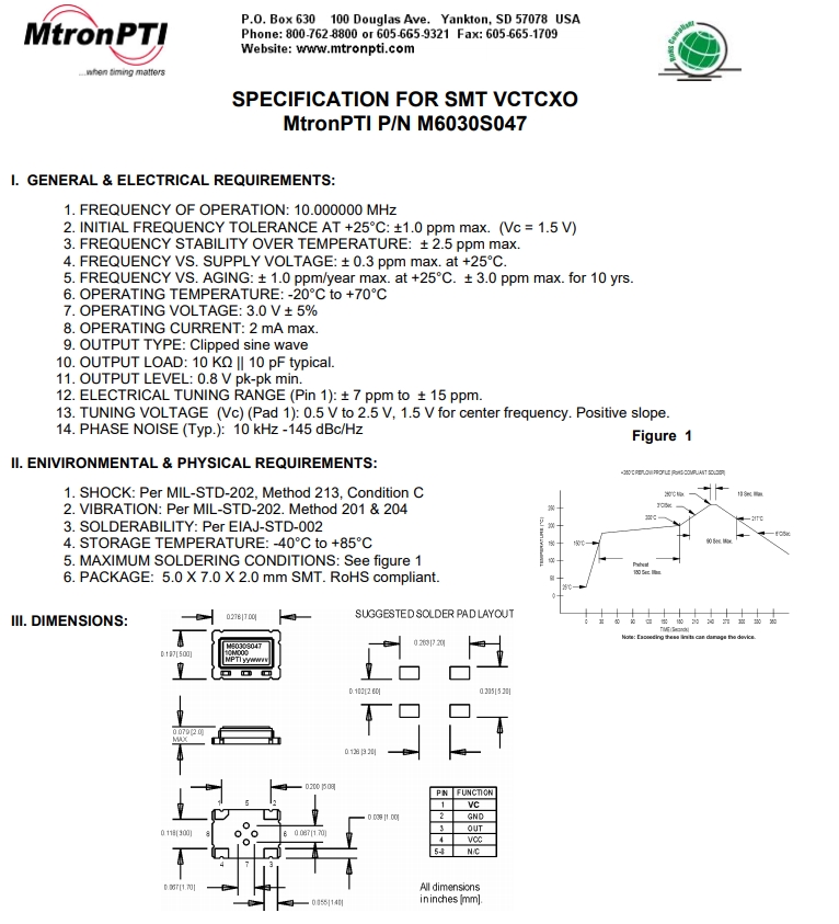 M6030S047 10.000000|M630x|MTRONPTI晶振 ,MTRONPTI晶振, 型號M630x ,編碼M6030S047 10,精度±2.5PPM,頻率10MHZ,電壓3.0V,輸出Clipped Sinewave,尺寸7050mm,石英晶體振蕩器,石英晶振,有源晶體振蕩器,VC-TCXO振蕩器,工作溫度范圍:-20°C-75°C,四腳貼片晶振,特點:低相噪,低衰減,低電源電壓,低功耗,低差損,可以廣泛應用在汽車導航,GPS導航,輪船導航,飛機導航,汽車雷達,飛機雷達,探測器,掃描機,無人售貨機等.