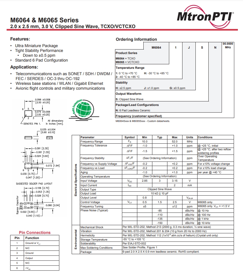 | M6064S025 32.000000 | M6064 and M6065 | ±2.5 ppm | 32 | 2.5 X 2.0 mm | -30°C to +75°C | 2.5 |